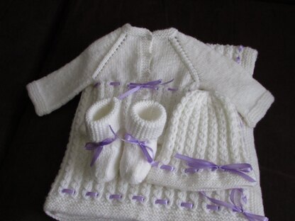 The Lily New-born Baby Set provides all that you need to welcome your newest favorite person to the world. The set comprises of a baby blanket, cardigan, beanie and booties. Thread through your preferred ribbon depending on the baby's expected gender or a gender neutral ribbon and you will have the most wonderful gift any expecting mother will love!!!