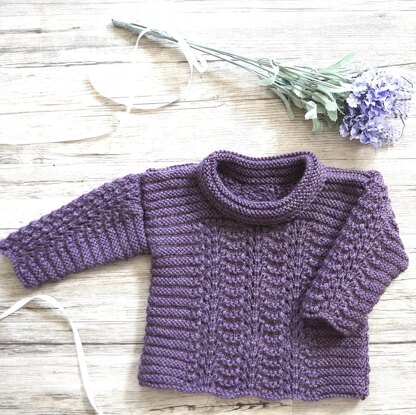 This cute sweater is both practical and classic and would be suitable for everyday wear. The roll neck collar adds extra warmth and the drop sleeves for comfort. Has a ridge pattern down front, back and sleeves, with a simple lacy feather and fan pattern going down the centre at front and back and sleeves, adding that extra touch. This pattern would be suitable for the advanced beginner.