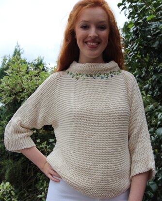 This original designer knitwear pattern from Award Winning Designer Marianne Henio is for the Lily Sweater. It is knitted in a 100% cotton double knitting yarn in garter stitch throughout. Both the back and front pieces are knitted in one piece. Marianne has added a touch of embroidery around the neckline, but this is up to you.