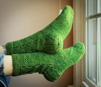 Sizes: 7 ½ (8, 8 ½, 9, 9 ½)”/19 (20 ½, 21 ½, 23, 24) cm finished foot circumference; length adjustable. Socks intended to be worn with ¾–1”/2–2 ½ cm negative ease.