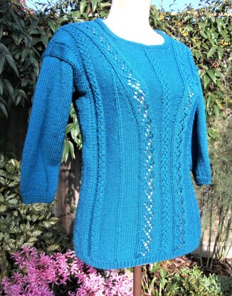 The vertical braid patterning, as well as the slopping lacy panels, produce an exciting effect that’s very flattering. The braid patterning is made up of twisted stitches (no cabling!). The lacy panels remain constant throughout as the shaped “V” effect is achieved by increasing and decreasing at each side of the panels. The back is simple with just those lovely braid stitch lines and a single knit stitch, all running through to the shoulders. The sleeves are 3/4 length and worked in stocking stitch. The neckline is edged with a neat little rouleau effect border.