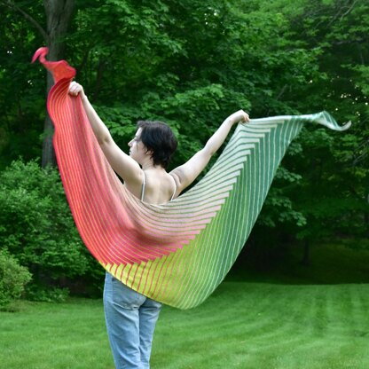 This wrap uses contrasting gradient yarns to create a stunning visual effect. Stripes provide color contrast; shaping bends the stripes into a chevron shape; and the addition of short rows changes the width of each stripe. As the stripes cross the center line, the proportion of colors reverses from thick to thin and thin to thick. Picking the colors for this shawl is a lot of fun - you can go with harmonious hues for a subtle look, draw inspiration from nature as in the sample, or pick wildly contrasting tones for a statement piece.