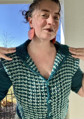 Looking for a cozy thick layering piece to add to your wardrobe this fall? This vest is so cozy and it has pockets!!! The colorwork is simple but creates such a unique and fun fabric! Don't worry, there are no extra ends to weave in!!! The specs: Sizing ranged from size XS (28" bust and 600 yards of bulky weight yarn) to size 6X (66" bust and 1340 yards of bulky weight yarn). You will need a 9mm or hook for gauge! Level 5 bulky weight yarn! This vest is made in a single panel (meaning very minimal seaming), the button holes are easier than you can imagine, and the finishing details are so thoughtfully straightforward and simple!!! Stitched in Bulky yarn this works up super fast!