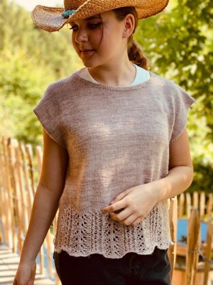 The cropped Linen Top is knitted seamlessly, beginning at the back neck and shoulders with a provisional cast on. After working the back until underarm, the front starts at the provisional cast on. After joining front and back, the top will be knitted in the round and ends with a summery lace hem. There are no shaping decreases and increases along the body sides. It will be worn with approx. 10 -15 cm (4.0-6.0”) positive ease around the bust. The brown one shown in size S and on an 91cm (35.2”) bust.