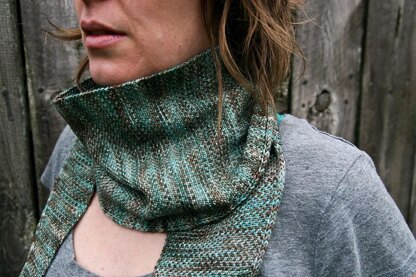 Yarn: 430 yards fingering-weight yarn. Samples shown in Black Trillium Lilt (85% Superwash Merino/15% Mulberry Silk, 100 grams/430 yards), colorway Patina (blue & brown version), and Big Alice Foxtrot (50% Silk, 50% Superwash Merino; 100 grams/437 yards), colorway One-Eyed Jack (red version). Gauge: 22 sts = 4 inches/10 cm over stockinette stitch. Needles: US #6/4mm needle, circular or straight, or size to get gauge. Notions: Stitch markers, tapestry needle. Skill level: Advanced beginner. Size/Finished measurements: One size fits most. 70” across, 8.5" deep at center back, measured after blocking.