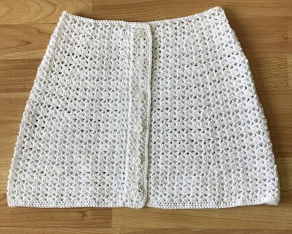 This pattern is topdown and seamless, so you can try it on as you go. The only sewing you need to do is sewing on 6 buttons at the front. The skirt is an A-line mini.