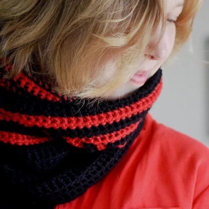 Liquorice is a one-looped crochet cowl worked in the round. The stitch pattern, which mimics knit garter stitch, uses just one basic crochet stitch: single crochet.