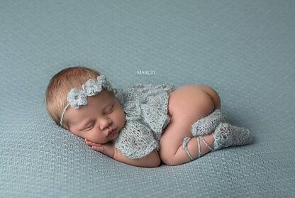 This beautiful set that includes the cape/skirt and shoes is made from mohair and is intended to be used as a photography prop. The cape/skirt is knitted in the round. The slippers are worked flat and the sole is sewn on. A simple single crochet stitch is used for the ties.