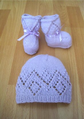 A pretty hat & booties set to match all of the cardigans in The Little Darling Cardi Collection and dresses in The Little Darling Dress Collection