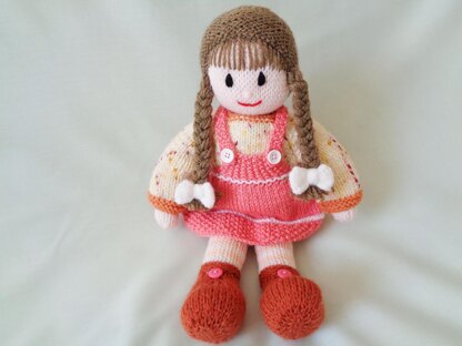 Leah is a 13 inch (34 cms) doll knitted in DK yarn. Hair is knitted in reverse stocking stitch, sewn in place with strands of yarn added for plaits/braids. Pinafore and jumper/sweater are also in DK yarn and are removable.