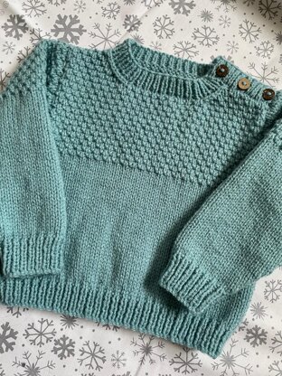 Designed especially for little ones, this cosy double knit sweater features a textured pattern over the upper body and sleeves and loose styling for extra comfort. The functional buttons along the left shoulder are practical and could also be a decorative touch. Each part of the sweater is worked flat from the bottom up, with stitches picked up from the cast off edges to create the neck and button bands.