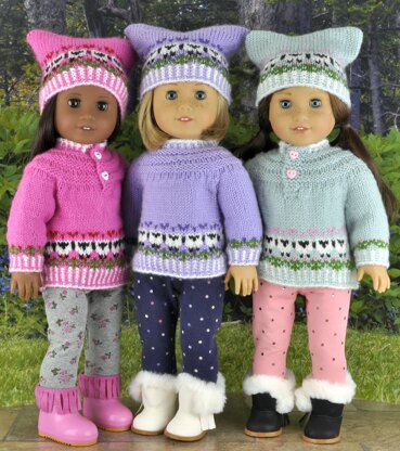 This is a PDF pattern for a stranded fair isle pullover sweater and matching hat to fit an 18 inch doll similar to American Girl dolls. The sweater has a placket opening with buttonholes which can be worn at the front or the back. The body, sleeves and hat are knitted bottom up and in the round using stranded fair isle technique. Body and sleeves are knit separately to underarm then joined for the yoke. A placket opening is created at the back, beginning at the start of the yoke. The cuffs, hat band and hem of the sweater are knit in 2-color corrugated rib. The pattern PDF is 23 pages and includes written instructions with charts for the fair isle design. This pattern is designed by me and was tested by 6 other knitters. This purchase is for a PDF KNITTING PATTERN, not the doll or clothing pictured.