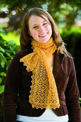 This shawl and scarf are put together from traditional Shetland lace patterns. The diamond area in the centre, identified as "Mrs. Montague's pattern" by Sharon Miller in her book Heirloom Knitting, is a field of bead motifs; the border sections are beads interspersed with Madeira ferns. When the stole is worn, the ferns are upside-down, where they look like a child's drawing of flowers. The edging is knit last and is attached to the stole or scarf as it is worked.