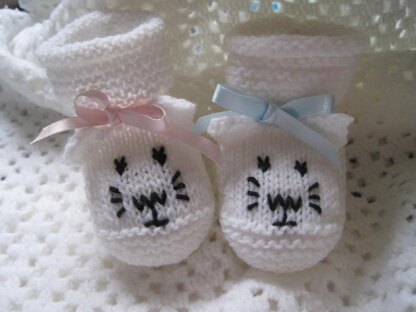 These sweet kitten baby booties are a quick knit, worked flat on two needles using 4ply yarn. They have a small amount of embroidery for the facial features. The booties have a garter stitch sole, stocking stitch instep and a garter stitch cuff with a roll edge. The detailed pattern includes row by row written instructions and photographs to help you along. I enjoyed the design process as I haven't worked with 4ply/fingering weight yarn for a while!