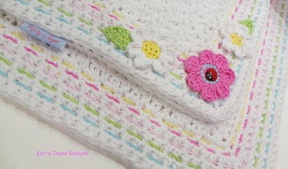 Crocheted in a silky soft cotton yarn, with three panels of pretty ‘V’ stitch crochet, a cute, colorful threaded border and finished with beautiful crocheted flowers!