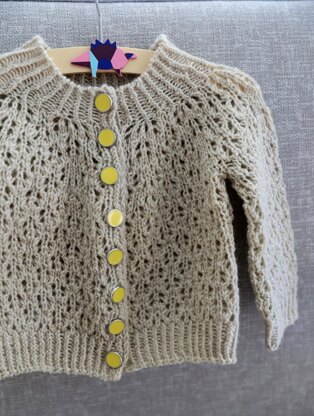This sweet little cardigan is a kids’ version of Matta. The cardigan is worked flat, top-down and, of course, seamlessly. The cardigan has a round yoke, long sleeves, and a cute all-over lace pattern. The back of the neck is shaped taller with short rows.