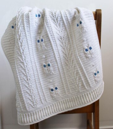 This pattern is a written pattern with some photos to help you. You will need to know how to do fpdc, as well as sc in the back loop only. The completed blanket measures 25" x 24". You will need a 4.5mm hook and about 12 ozs of light weight yarn. I used Loops and Threads Snuggly Wuggly. Please note that Ravelry has this particular yarn listed as a sport weight/dk weight yarn. The ball I used has it listed as a light weight (#3).