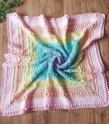 This blanket is made from the centre out in joined rounds, working 10 rounds per colour with a few different textures. The finished blanket measures 36” square.