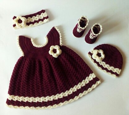 This Pattern Contain crochet baby Sara's dress, hat, headband, booties and 3 layer flower.