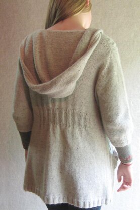 Little Riding hoodie is a tunic length hooded cardigan with cables, knit-in pockets, generous hood, ribbed back to cinch in at waist, lots of pretty cable decreases and knitted toggle buttons.