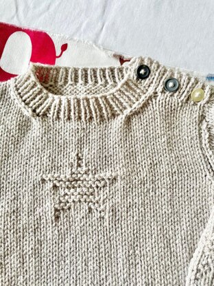 Designed especially for little ones, this practical double knit sweater features a garter stitch star across the chest, a smaller star on the left sleeve and loose styling for extra comfort. The functional buttons along the left shoulder are practical and could also be a decorative touch.