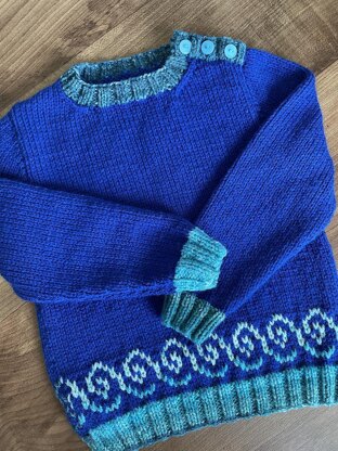 Inspired by the seashore, this cosy double knit sweater features a fair isle style wave motif, shown here in a self-striping yarn for added interest. Functional buttons along the left shoulder are a practical help in dressing smaller children, but also a decorative touch. Each part of the sweater is worked flat from the bottom up, with stitches picked up from the cast off edges to create the neck and button bands. Please note that the colourwork is charted only.