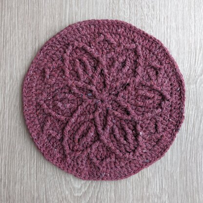 Live Again is a crochet circular trivet , made up of various interesting front post stitches to shape the flower pattern, using recycled yarn to give the fibers a second life.