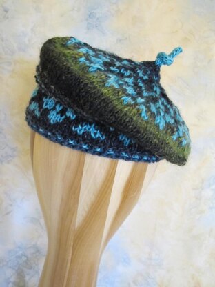 A simple yet elegant design makes this beret a fast and fulfilling knit. It begins with a slipped stitch edging, progresses to a fair-isle hat band, continues with a mixture of stockinette stitch and fair-isle, ending with an I-cord top knot. The pattern includes color charts and line-by-line instructions.
