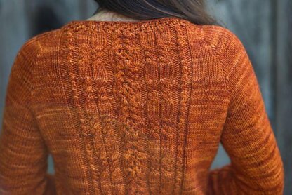 Lizbeth is the consummate autumn pullover. The deep, rich orange is reminiscent of October leaves. The beautiful detailed stitch pattern reflects the beauty found in the details of leafs, pine cones, and nut shells. The fit and style are as comfortable as the cool evening air after the dog days of summer. Lizbeth was designed with Malabrigo worsted, a soft single-ply yarn with a rustic stitch definition. This sweater will not spend much time on your shelves or in your drawers during the syncopated days of autumn.