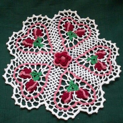 These rose buds will never wither or die and are surrounded by a heart to share the love of budding roses with everyone in this thread crochet doily pattern. A fully bloomed rose accentuates the center. The crochet stitches include, sc, hdc, dc, tr and sl st. The pattern includes description of American abbreviations and complete instructions. Contact information is on pattern if you have any problems, feedback or just want to show me how beautiful it looks. Finished Size: 10 inches (25.5cm) round diameter. You will need Boye Steel Crochet hook size 1 (2.25mm)and size 10 crochet cotton, a background color (67 Yards), a main rose color (33 Yards) and contrasting rose color (27 Yards) and a stem color (4 Yards). The rose buds and center rose stand out from the doily to give a three-dimensional effect. *Uses US crochet terms