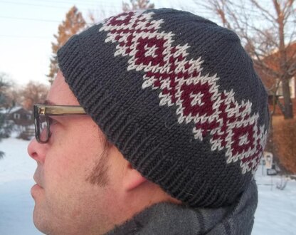 I designed this hat for my husband, who wanted a Fair Isle hat, but didn’t like any pattern I could find. He picked the Fair Isle Motif from Mary Jane Muckelstone’s 200 Fair Isle Motifs. It is knit in an incredibly soft merino, which gives it crisp color contrast and a little bit of stretch. The hat fits close to the head, and is also very warm.