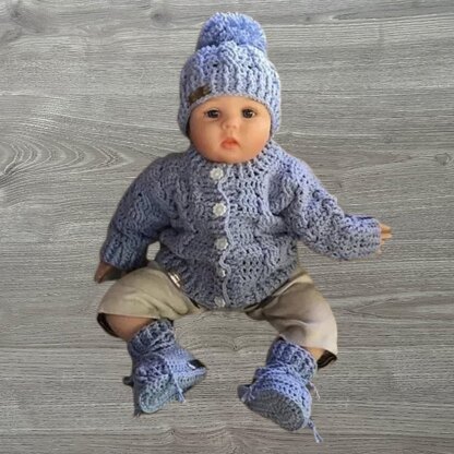 Lola crochet cardigan, hat and booties set pattern for 0–3 months to 12–24 months with hat to 8–10 years, worked seamlessly for everyday wear and thoughtful handmade baby gifts. The cardigan and booties are worked bottom up, the hat top down in the round, with booties sized by hook.