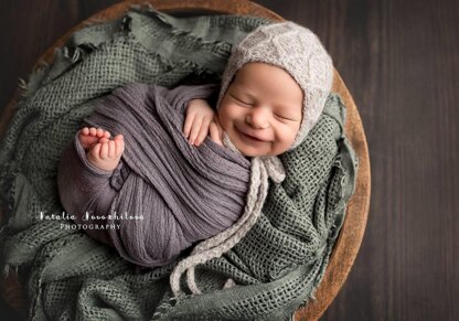 Lollo is a delicare knit bonnet in newborn size. Designed for newborn photography,this bonnet has a cut hourglass pattern and long knit ties. Drop Sky is the perfect yarn for this project,as it has a lot of stretch and it's so light and soft. You'll need a bit more of half skein for completing your bonnet. Bonnet is knitted flat on circular needles and seamed at the end.