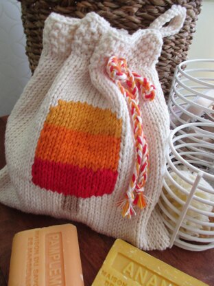 This is a pattern for Lolly Washbag, part of the Make at Home range. It has a simple intarsia motif on the front and plain back. the top is in moss stitch with eyelets and a tie fastening.