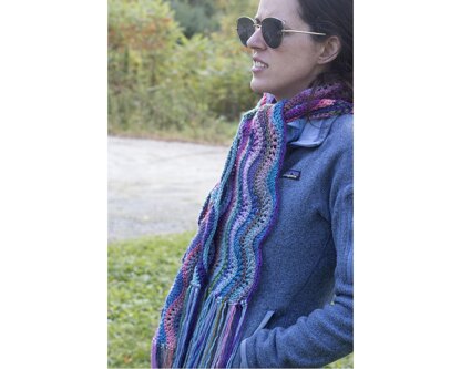 I've crocheted it in readily available Red Heart Unforgettable yarn but almost any multi-color worsted yarn can be used. You need about 540 yards for the scarf.