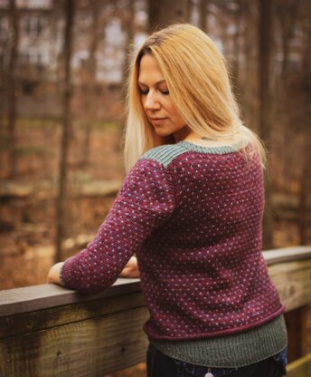 Long, Long Time features an easy-to-memorize lice stitch pattern, contrasting saddles, cuffs and collar, and a unique double hem that’s slightly cropped in the front but dips down in the back for more coverage. It uses two beautiful, rich colorways from Little Fox Yarn in the Bōsa base, a Merino, silk and yak blend that’s soft and drapey with a hint of halo. This pullover has a saddle shoulder construction that begins with knitting the two saddles that cover the shoulders. Stitches are picked up from their long edges to create the yoke. Front and back are joined at the underam and the body is knit in the round. Seamless set-in sleeves are picked up around the armholes, shaped with short rows and then knit in the round to the cuffs.