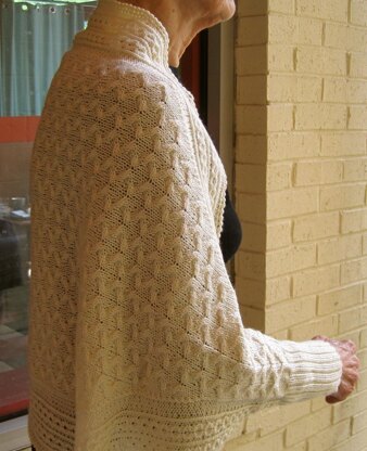 This easy-wear cuffed shawl allows you total freedom of motion while wearing a shawl. The long ribbed cuffs keep the shawl on your shoulders comfortably while complimenting your accompanying outfit. You'll never not want to put this on as you dash out of the house. I-phone use is infinitely easier with this shawl. There are instructions contained within the pattern for adjusting the length to customize it to your size.
