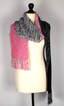 Garter stitch on the bias, holding two strands of yarn together, blending pink to black. Add some fringing and your ready to go!