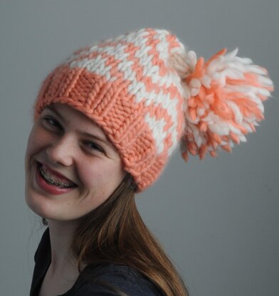 This hat is knitted using slip stitch so you’re not working two yarns at the same time to complicate matters! Super quick to make, super lovely.You will need: Mrs Moon Plump: 1 x Main colour MC (show in Marshmallow) 1 x Contrast colour CC (shown in Crème Caramel) 10mm and 15mm circular needles (40cm) and 15mm dpns for decrease.Size: fits average adult headFinished Measurements: 48cm circumference (unstretched), 26cm highGauge: 10sts to 10cm using 10mm needles