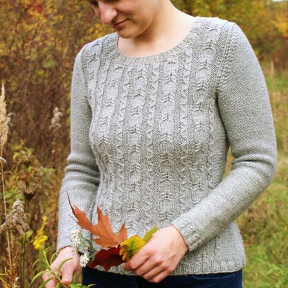 Lorenzia is worked in pieces from the bottom up and seamed after wards. The sleeve caps are shaped using short rows. Two different slim cables and reverse stockinette stitch make this sweater sophisticated and casual as well.