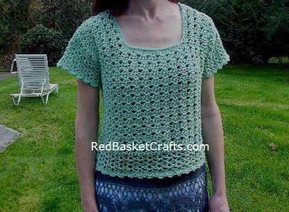 Summer top with short sleeves worked in two separate pieces (back and front) from shoulder to hem. Recommended yarn (used for sample): Yarnspirations Caron Cotton Cakes - worsted weight, solid color, 8.8 oz 250 g, 530 yds 485 m per ball: 1 {1½-1½-2-2} balls for respective sizes S {M–L–XL–2X}. Recommended substitute yarn: acrylic/cotton worsted yarn, above yardage.