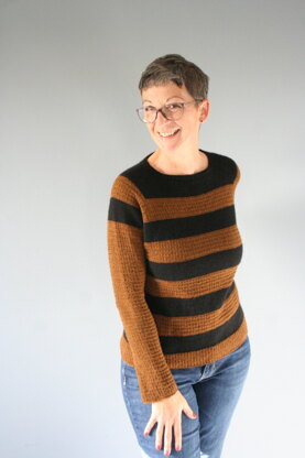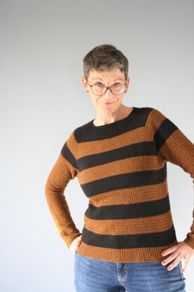Lost Places is a top down raglan sweater with long sleeves. The texture pattern (brown) is contacted by stripes in stockinette stitch. The shape is sporty and close to the body. I have 5 cm positive ease on my sweater, but you can also knit a larger size if you like more positive ease. The neckline can be framed by a sporty narrow edge or a turtleneck.