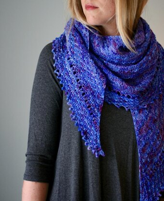 Louloudi (the Greek word for flower) is a crescent-shaped shawl embellished with garlands of daisy stitch that create a beautiful texture and perfectly utilize the color changes of a pretty variegated yarn. Knit from the top down, Louloudi is shaped into a crescent with simple increases on every row. Short rows create small slices of Stockinette between the strands of daisy chains and create an overall asymmetrical shawl. A picot bind off finishes things off. Taking two skeins of fingering weight yarn, either in one color or two, Louloudi is a light-but-warm and striking piece that will keep away the chill as you take a walk through the wildflowers.