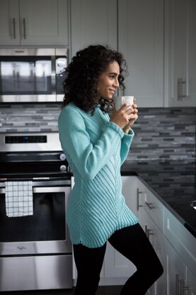 Lounge is a comfortably oversized sweater which is perfect for rainy days spent indoors with a cup of tea and a good TV show. The diagonal rib creates a bias fabric that flatters the figure and sits well over curves. It features a rounded split hem that moves upward into diagonal stripes that gradually become further apart as they head towards the top of the sweater. The collar and cuffs feature a folded rib adding to the squishy texture.