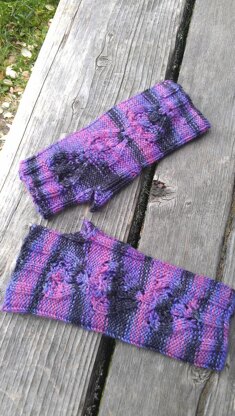 With fun cable and lace hearts and a simple ribbed hand and, this pattern was designed to look great in solids and absolutely SMASHING in a fun variegated yarn. Add sparkles and you get a fun accessory that is almost magical. Depending on the yarn, the pooling can have unexpectedly fun results...like an girly-camouflage ready for bat