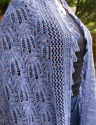 It is made up of three different lace stitches that are both written out line by line, and charted. The final size is 24 inches by 74 inches. All three of the stitches are from the Shetland type of knitting, and the edging is knitted on, again, as is more common with the Shetland shawls.