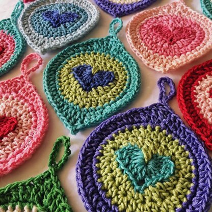 The Lovebomb Christmas Ornament has the heart I use to Lovebomb (giveaway crocheted hearts in a random act of kindness) in it’s centre. It begins with a heart in a circle then becomes an ornament to hang on your tree or if made in smaller weight yarn as a decoration on gifts.