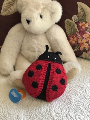 LoveBug is knit in-the-round from the bottom up, french knots are placed for eyes before finishing head. Stitches are picked up for the wings which are knit flat, right wing first, then left wing. Antennae are added using simple crochetstitches.