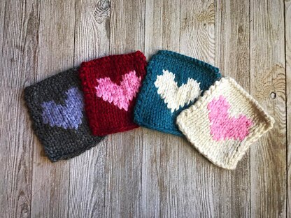 This pattern is written in standard English knitting terms. It also includes a chart for easy reading of the heart design. This knitting pattern uses bulky weight yarn and sizes US 8-5mm needles. You could knit a lot of these in a day. They make great coasters, patches, blankets, placemats, or appliques. Knit them as a set of coasters for a friend, Knit allot of them and seam together to make a baby blanket or placemats. I was able to use up a lot of scrap yarn making these and it was fun to see how many fun color combinations I could come up with.