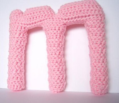This letter m is approximately 6 inches tall and 7 inches wide. This item is crocheted and then stuffed with polyfill stuffing.